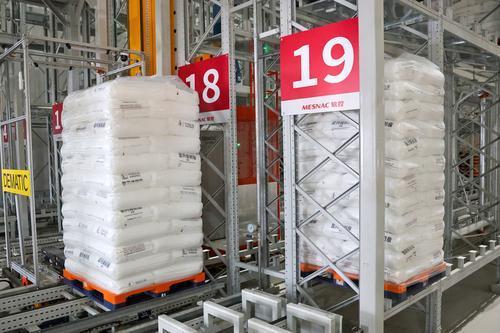 在扬子石化塑料厂智能包装库,有轨穿梭小车运送包装好的成品垛。本报记者 李树鹏 摄