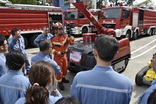 5月9日,在全国防灾减灾日到来之际,国家危险化学品应急救援上海石化队举办沉浸式防灾减灾科普体验课堂,以“理论讲解+场景教学+实操体验”的形式,为员工讲解消防和抢险破拆装备的使用方法,传授应急处置技巧,提升员工应急处置能力。图为消防员介绍消防机器人。邢秀涛 摄 李 娟 文