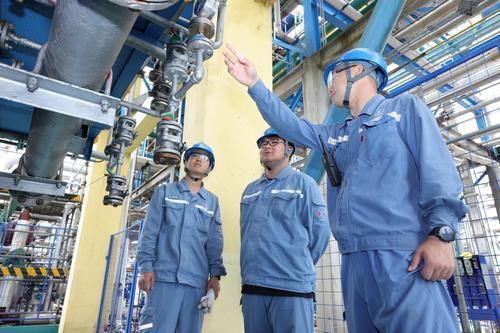近日,上海石化化工部利用装置大检修时机,实施“检修+培训”模式,把检修现场作为培训的“活教材”,由技术骨干带着新员工到现场学理论知识、提升实操技能。图为该部聚乙烯醇车间员工在检修现场开展培训。高卫洪 摄