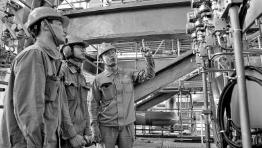 近期,海南炼化在1号芳烃蒸汽升压项目建设过程中,调派青工参与“三查四定”、开工准备、管线酸洗等重点工作,强化现场“传帮带”,引导激励青工立足岗位学技精艺、成长成才。图为6月25日,芳烃部设备副经理周彬(右)在现场为青工讲解项目工艺流程。