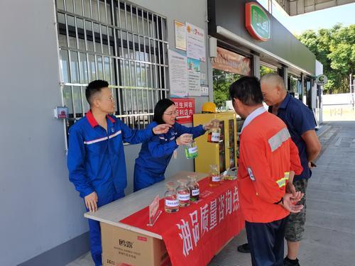 图3:9月以来,浙江石油通过多渠道宣传企业质量文化,在油库、加能站设立咨询点开展油品知识普及,讲解日常用油方法。图为9月22日浙江绍兴油库质检室员工向顾客普及油品质量相关知识。李佳雯 摄 邱丽莉 文