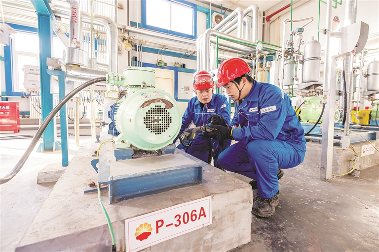 大庆石化建成国内首套1-辛烯等α-烯烃合成工业试验装置,可在不同工况下切换生产1-己烯、1-辛烯、癸烯等系列产品,有力提升中国石油在α-烯烃领域的技术优势和产业优势。图为岗位员工正在监测机泵运行参数。刘彦峰 摄