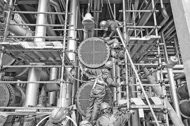 图为云南石化炼油四部检修现场,施工人员正在回装换热器。