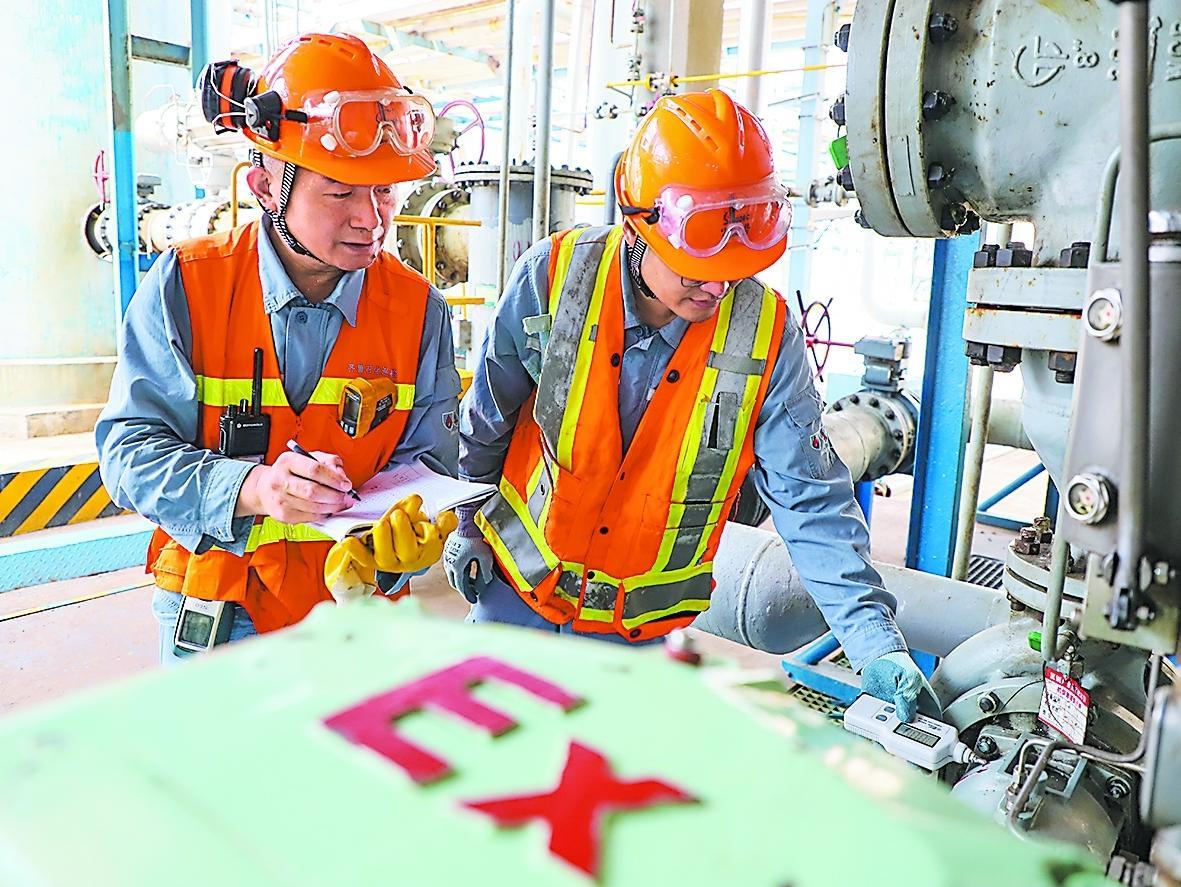 齐鲁石化氯碱部员工开展机泵测振工作。刘芳芳摄