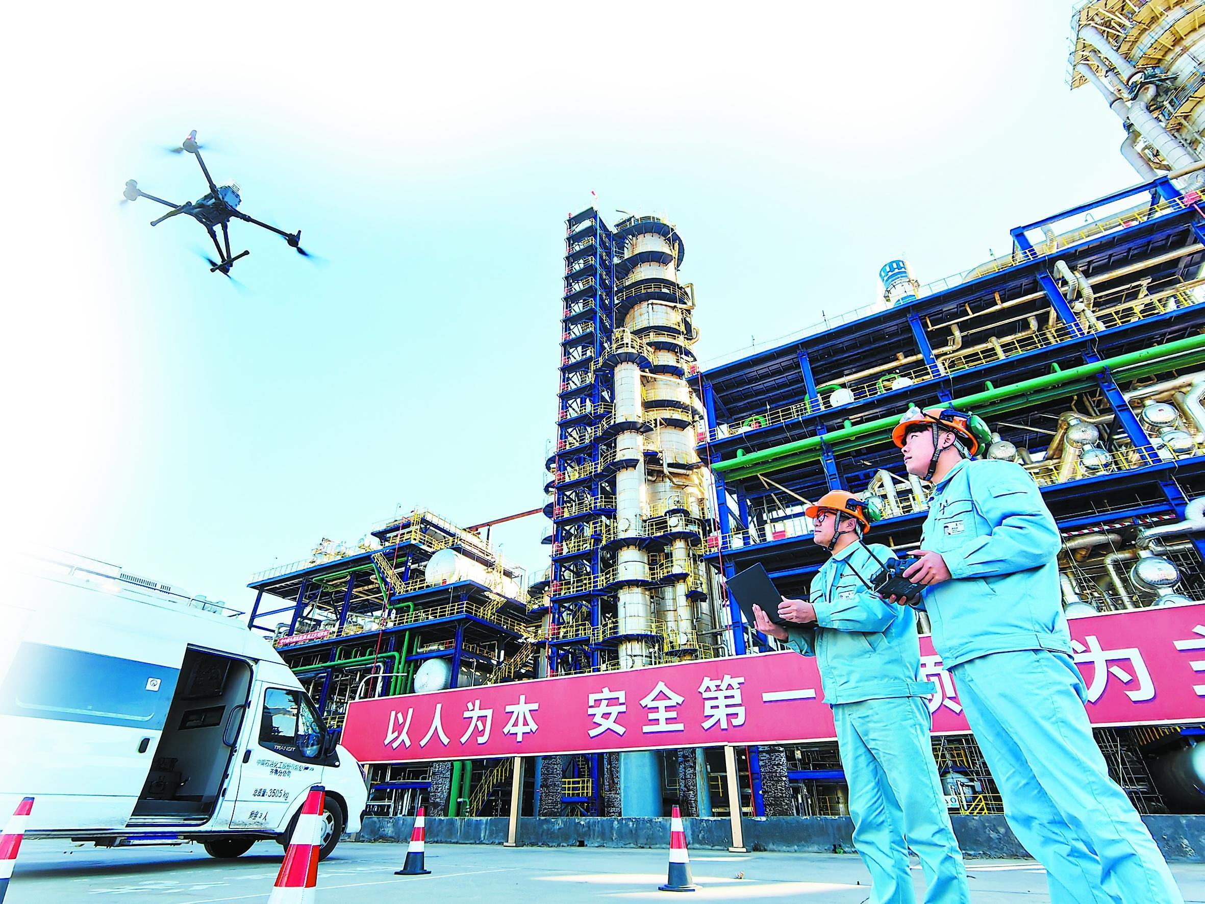 齐鲁石化检验计量中心员工遥控无人机执行大气VOCs(挥发性有机物)数据采集与监测任务。李雪梅 摄