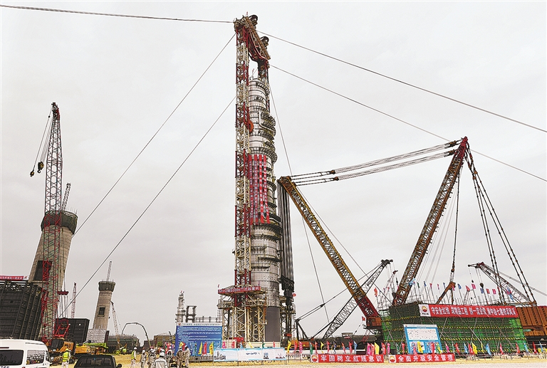广东石化炼化一体化项目抽余液塔,实现4000吨级超大容器制造、运输、吊装一体化新突破,并创亚洲最重塔器吊装纪录。姚民 摄