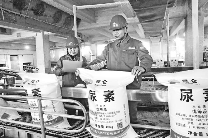 图为岗位员工对尿素产品进行出厂前的质量检验。