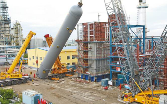 这台反应器是超大型设备。为此,大庆石化化建公司精心制定吊装方案,采用一台400吨主吊、一台300吨和160吨辅助的"一主两辅"形式进行吊装,克服雨天和作业空间狭窄等困难,将反应器一次吊装成功。(廖和明摄)