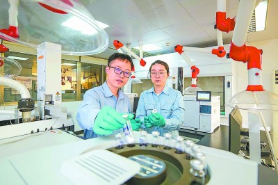 茂名石化研究院锚定目标开展多项攻关,推动高附加值新产品加速从实验室走向生产线、迈向市场。图为近日科研人员进行新产品性能测试。