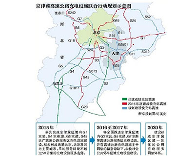 2016年至2017年,将全面推进京津冀区域内G3京台、G5京昆、G7京新等高速公路服务区充电设施,并在高速公路充电设施主干网络的辐射带动下,加快社会公共停车区域充电设施建设。到2020年,建设形成京津冀区域一体化的公用充电服务网络体系。