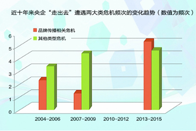 研究者总结和梳理了近十年来中国企业“走出去”遭遇的重大危机,并将这些危机分成投资并购危机、商业政治化危机、跨文化冲突危机与程序制度性危机四类。其中,第二类的商业政治化危机与第三类的跨文化冲突危机属于品牌传播相关危机。研究团队发现,与品牌传播相关的危机自2013年开始显著增加,在各类型危机中所占比重已超过五成。这一趋势说明,在“品牌传播”上的弱点已成为央企“走出去”过程中的巨大隐患;未来,在“品牌传播”上的表现将成为决定央企“走出去”顺遂与否的重要指标,加强央企品牌传播建设已刻不容缓。
