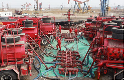 油气井水力压裂是由高压泵将压裂液以超过地层吸收能力的排量注入井中,在井底造成高压,以克服最小主地应力、岩石的抗张强度与断裂韧性,使地层破裂并延伸出裂缝,在裂缝形成后,注入混有一定直径、较好圆度和球度、较高强度和较高分选度的支撑剂,用于支撑已形成的裂缝,最终实现增产目的。1947年,油井压裂作业首先在美国试验并获得成功,而后得到广泛推广和应用。上世纪50年代和60年代,压裂主要用于单井的增产、增注。70年代,随着大量的低渗透油田投入开发,压裂工艺技术得到越来越广泛的应用,并成为最主要的提高单井产量的手段。80年代,迎来水力压裂发展史上极为重要的阶段。水力压裂技术由传统的单井作业发展到与油藏工程相结合的整体设计、优化及作业上来。进入90年代以后,水力压裂成为决定低渗透油田开发成败的核心技术。