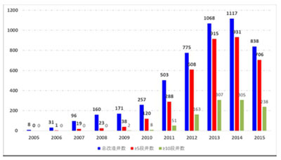 2005年至2015年水平井改造分段数统计