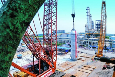 6月2日,国内首套水煤浆自有技术工业化应用项目——镇海炼化POX(煤焦制氢)项目的关键设备1号变换炉吊装成功。该项目采用SE水煤浆气化技术,2015年进入中国石化“十条龙”科技攻关项目,由镇海炼化、宁波工程和华东理工大学联合攻关,共有19项专利。图为1号变换炉正在吊装。