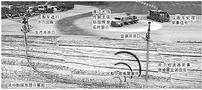 微地震监测技术是在水力压裂、二氧化碳压裂时,在目标井旁,选取深达数千米的已钻井口下入井下检波器,或者以目标井为中心,在方圆数公里内,采用数千个地面的地震检波器,采集压裂造成的岩石破裂的微地震信号,再通过专业软件处理,结合工程和地质解释,实现“看见”压裂时人工裂缝生成和走向情况的高科技手段。
