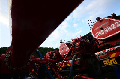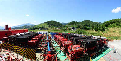图为:华东油气分公司平桥南焦页194-2HF井压裂施工现场。