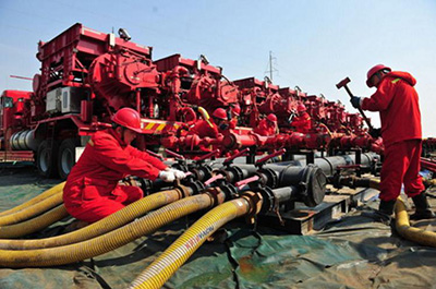图为连接压裂管汇设备。王志田摄