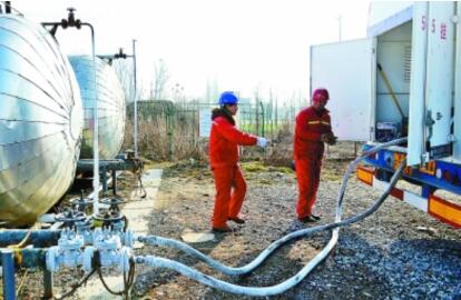 华玲(左)接收每天送到井场的液碳。