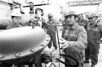 江苏油田通过技术大比武提升员工技术水平,培养风险意识强、业务精的安全铁军,并为集团公司技术比赛选拔选手。图为8月16日,真武采油管理区为参赛员工讲解三项分离器工作原理。范友林 摄