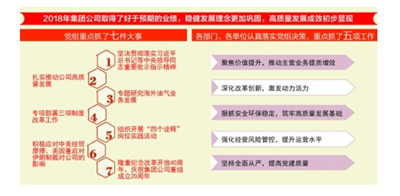 良好业绩的取得,得益于集团公司党组强化领导作用,更好地把方向管大局保落实。过去一年,集团公司党组紧扣发展目标,做好顶层设计和统筹规划,重点抓了七件大事。坚决贯彻落实习近平总书记等中央领导同志重要批示指示精神;扎实推动公司高质量发展;专题研究海外油气业务发展;专项部署三项制度改革工作;组织开展“四个诠释”岗位实践活动;积极应对中美经贸摩擦、美国重启对伊朗制裁对公司的影响;隆重纪念改革开放40周年、庆祝集团公司重组成立20周年。七件大事,件件稳准有力,件件落地有声,从容不迫指导全局,推动各业务取得新成效新进步。