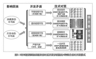 针对单井吞吐注采异步、驱替压差大、加热范围难扩大弊端,科研人员根据热干扰状况将气窜关联井分别组合为不同的区,在气窜发生前实施同注同采,平衡井间压力,采收率提高5.5个百分点;针对井间已发生严重气窜,错失同注同采时机的油藏,科研人员采用一注多采组合吞吐方式打开生产井,一注多采将原气窜通道变为加热通道,使得热波及效率提高17.4个百分点,采收率提高5.2个百分点。同注同采和一注多采在不同条件油藏组合运用,实现了不投入增效益。在这两个模式基础上,科研人员针对层间、层内动用不均衡,采用层间组合和复合调剖协同增效,扩大了开发波及区,进一步实现低投入高效益。