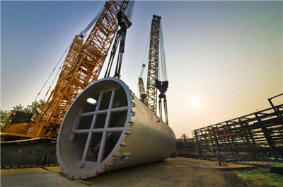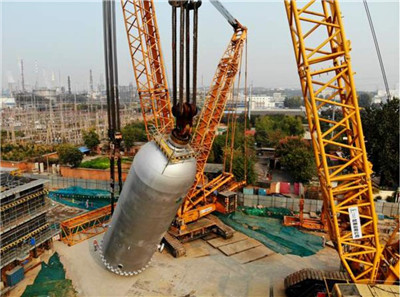 2000吨履带吊车为主吊,750吨履带吊车辅助。在主吊的强劲牵引下,百米吊臂直刺蓝天,拉出一道钢铁彩虹,吊装锁具牢牢牵住反应器顶部。辅吊相伴而起,缆绳紧紧系住反应器尾部。红绿旗帜指引,指挥哨音伴随,重达705吨的反应器R101缓缓升起、移动,于11点06分稳稳就位,吊装圆满成功。