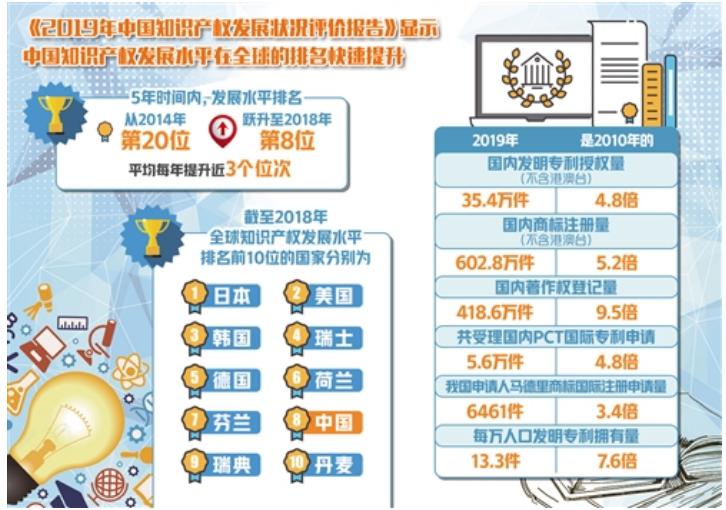 《报告》还显示,截至2018年,全球知识产权发展水平排名前10位的国家分别为日本、美国、韩国、瑞士、德国、荷兰、芬兰、中国、瑞典和丹麦。单看知识产权能力,我国2018年已跃居全球第5位,仅次于美国、日本、瑞士和芬兰;知识产权绩效更是排名全球第3位。这些都说明,我国知识产权大国的地位更稳了。