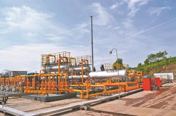 CPECC以国家大力发展页岩气产业为契机,研究掌握了页岩气开发地面工程集成解决方案,实现页岩气低成本、高效、绿色开发,通过先发优势,牢牢占据页岩气地面工程设计市场,先后设计建成四川长宁—威远、滇黔北邵通等国家级示范区。其中,浙江油田太阳—大寨区块页岩气平台采用页岩气标准化建设方案,集气脱水站采用全站模块化建设模式,实现设备统一采购、工厂内组橇,现场复装投运,将一座集集气、增压、脱水多种功能为一体的综合场站建设周期缩短至6个月,相比前期同等规模中心站建设周期缩短约50%。页岩气集气一体化集成装置。