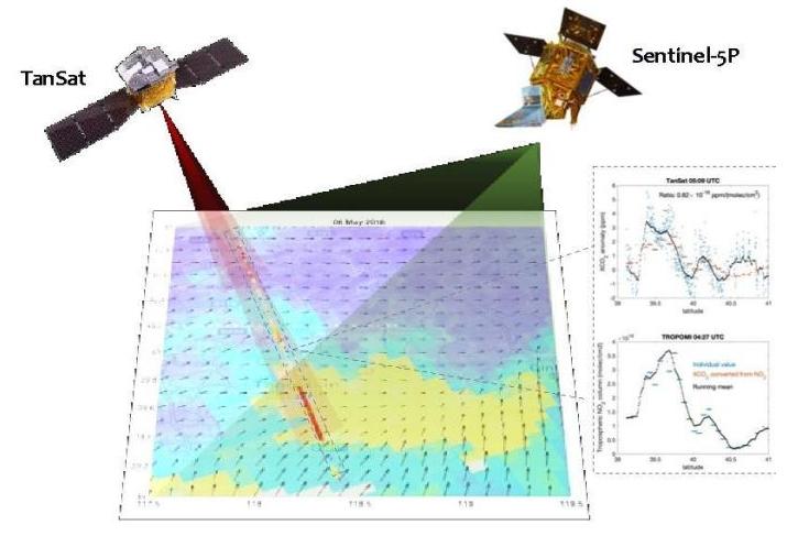 该团队认为,利用碳监测卫星进行全球人为排放的监测更具优越性,碳监测卫星直接观测大气二氧化碳浓度,但仅凭单一二氧化碳要素的观测,定量区分二氧化碳浓度变化源来自于人为排放还是自然过程是一个难点问题。化石燃料燃烧为二氧化碳人为排放之主要来源,而石油等化石燃料的燃烧伴随排放二氧化氮,即人为排放二氧化碳和二氧化氮具有较强的同源性,因此,理论上通过二氧化氮和二氧化碳的同步监测,就可以有效计算人为碳排放。