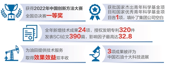 打造多元赋能研发平台体系。推进国家重点实验室重组,“提高油气采收率全国重点实验室”作为油气行业唯一入选全国前20的标杆实验室,行业引领和影响力大幅提升;推进数字化和信息化平台建设,为开启“云上科研”做好准备;持续关注国际石油公司投资动态与发展战略,连续6年发布《全球油气勘探开发形势及油公司动态》报告;《石油勘探与开发》影响因子大幅攀升至5.194,在全球石油工程类SCI期刊中排名首位。获得2022年中国创新方法大赛全国总决赛一等奖;获批国家杰出青年科学基金项目和国家优秀青年科学基金项目各1项,填补了集团公司空白;全年新增技术成果24项,授权发明专利320件,发表SCI论文390篇,影响因子最高达32.8;为油田提供技术服务,取得效果效益双丰收;3项成果被评为中国石油十大科技进展。