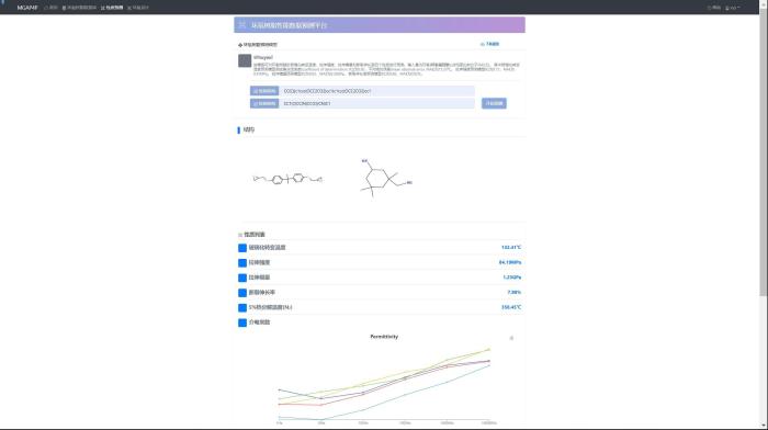 在林嘉平看来,开展以大数据技术为驱动、以AI为核心的高分子材料基因工程研究,可为解决这些难题提供有效手段,加速新材料的研发步伐。“我们建立的这个平台,通过对高分子材料研发中的结构性能进行数据挖掘,并集成机器学习性能预测、结构设计、配方及工艺参数优化等功能,加速高性能高分子的研发,推动大数据和人工智能技术为复合材料用高性能树脂产业赋能。”通过团队的现场演示,记者看到,用户在使用AIplus高分子软件平台进行高分子材料性能预测功能时,只需要通过点击“绘制结构”,分别将所绘制的环氧树脂和固化剂转化的字符串输入到对应的输入框中,再通过点击“开始预测”,短短几秒,页面就会返回后台计算出来的环氧树脂性能预测数据。这种虚拟设计、高通量预测的方法将大大提高其研发效率。