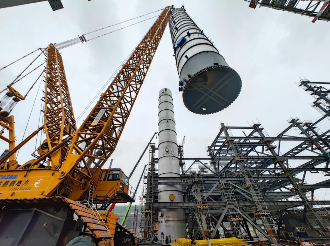 仪征化纤年产300万吨PTA项目最长最重塔器设备安装就位(图)