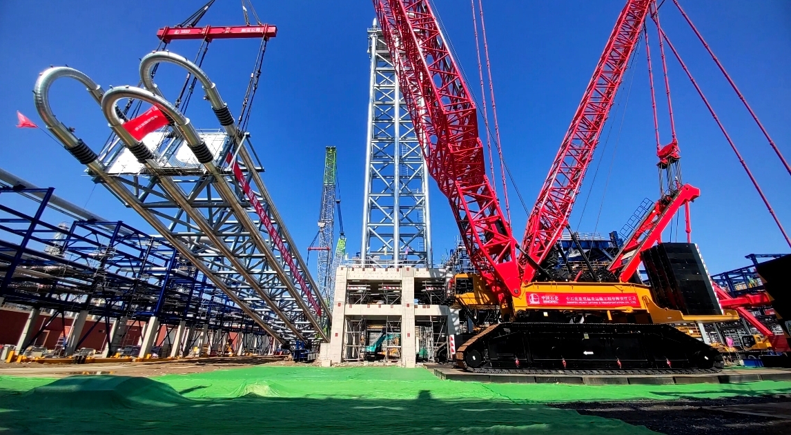 此次环管反应器设备高度76米,模块重量653吨,创新六管整体成框暨“日字形”模块化运输吊装新工艺,采用2000吨主吊+800吨溜尾递送法,配套自主研发设计的1000吨级可调节式环管专用平衡梁完成设备吊装,是世界上整体模块化设计制造运输吊装的单台最大环管反应器。