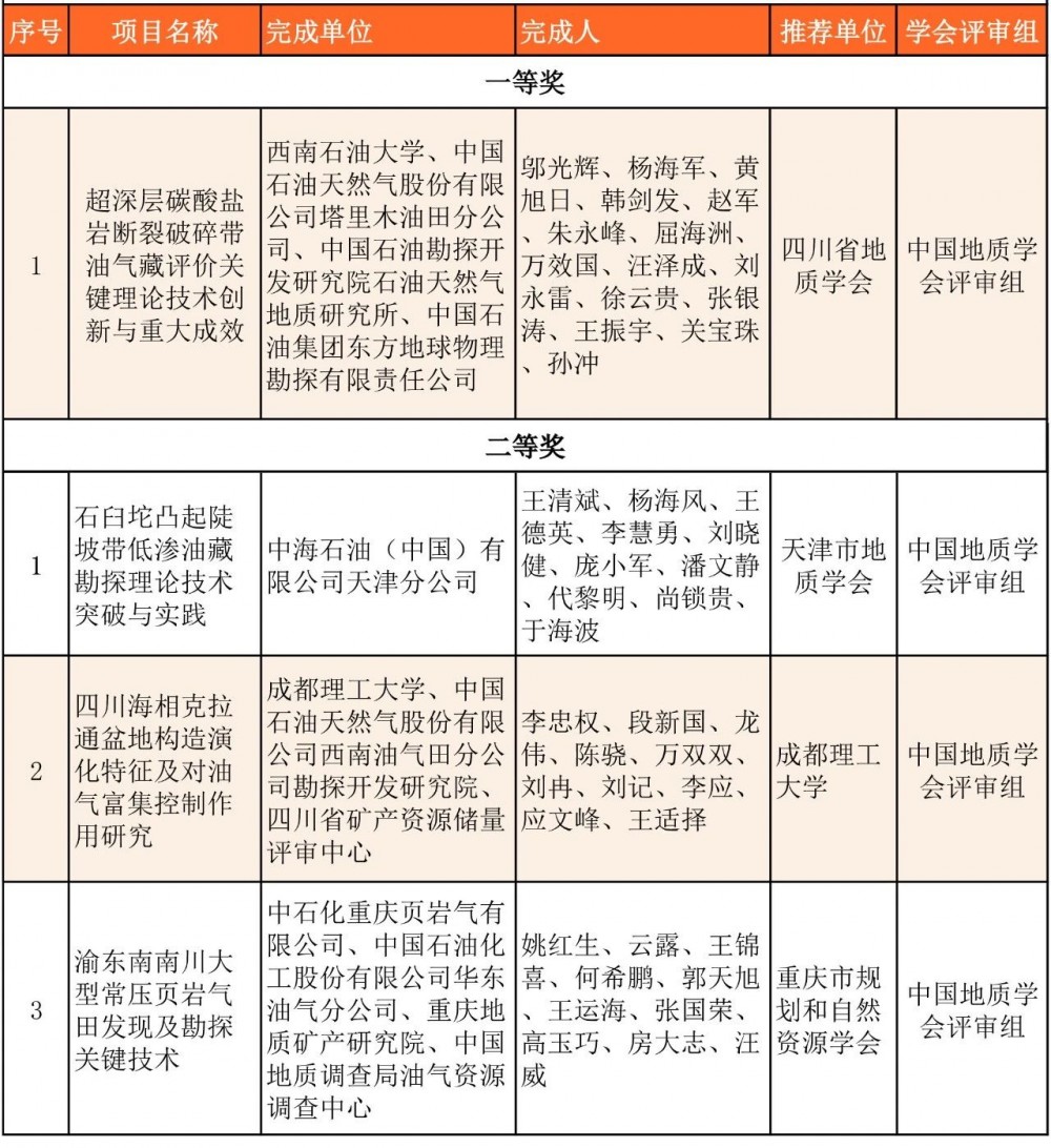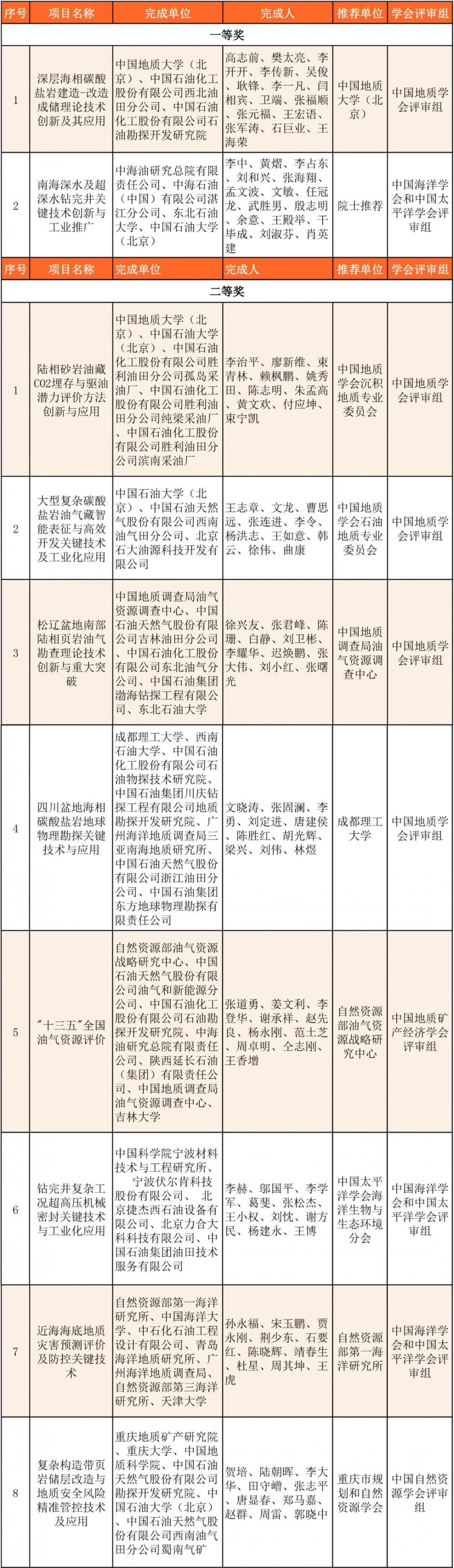 自然资源科技进步奖(共97项,其中特别奖1项,特等奖4项,一等奖14项,二等奖78项),其中,“三桶油”作为完成单位,2个项目获一等奖,8个项目获二等奖。