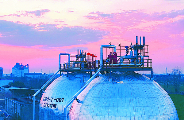 春节期间,华东油气分公司CCUS调峰中心全力保障油田二氧化碳压裂驱油所需液碳。图为2月13日正月初四,CCUS调峰中心员工巡检二氧化碳储气罐。