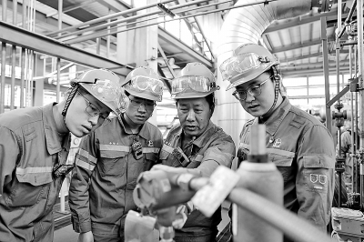 该工作室于2023年挂牌成立(此前为胡勇刚首席技师技术团队),由集团公司技能大师、镇海炼化首批炼化工匠胡勇刚领衔,技师、高级技师、中级工程师、高级工程师等11名成员组成。工作室以优化焦化装置工艺操作、降低装置运行能耗为方向,不断开发和运用新技术,提高焦化装置自动化和智能化程度,并积极承担人才培养重任。近三年,他们完成技术攻关创新项目10项、技术革新与推广5项;培养带领出一大批焦化装置骨干人员,其中7人已成长为技术管理人员或班组长。图为2月26日,胡勇刚(右二)在镇海炼化炼油二部焦气回收装置,为年轻工艺技术员讲解压缩机无极调量系统的设备原理和操作要点。