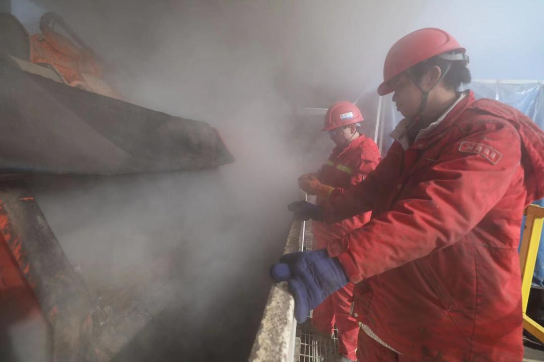井底160℃的钻井液从地层循环至地面,泛起阵阵白烟。通过钻井液循环系统中的振动筛可以将大颗粒物质与液体进行分离,清洗、晾晒之后便可得到井中的固体物质。这些固体物质往往还包括井壁的掉块以及坍塌物,而新鲜岩屑往往个体碎小、棱角明显,工作人员通过筛网进行简易的筛分后,根据不同的深度放置在百格盒不同的格子中。在深地塔科1井,为了取全取准万米井的地质资料,工作人员每米都要及时准确地捞取地下岩石样品,特别是进入9800米以后,更是每50厘米捞取一次岩石样品,通过地质分析为工程决策提供有力依据。