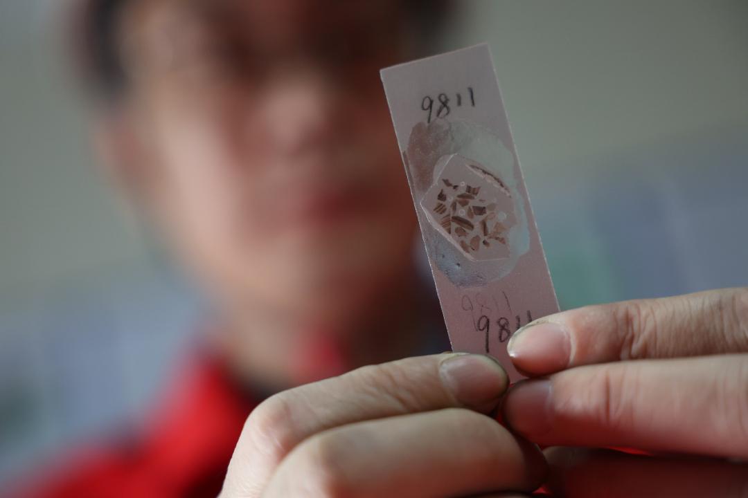 塔里木油田实验检测研究院地质实验中心的王孝明每天要打磨十几片岩屑薄片,据他介绍,首先要把岩屑打磨到微微透光,大概是头发丝的厚度,这个过程需要靠手感一点点感知厚度变化,最后结合显微镜一点点抛光矫正,直到达到标准厚度。
