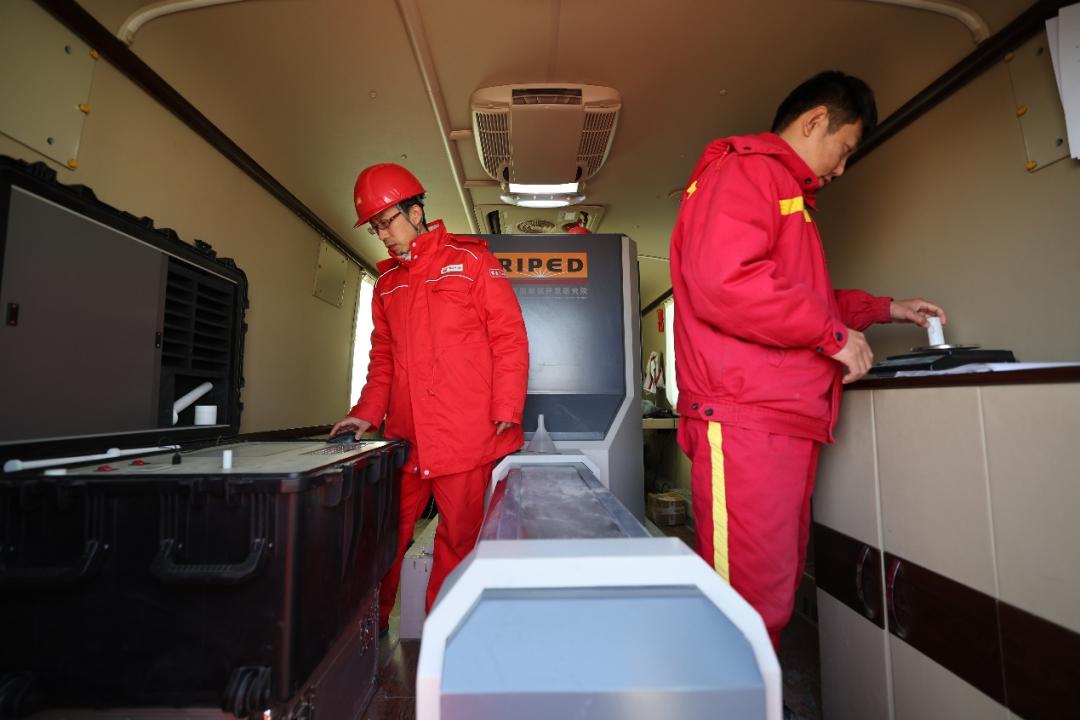 岩石也能做核磁在深地塔科1井井场的东南角,停放着一辆红白相间的货车,这是由中国石油自主研发的车载岩石物理实验室,里面搭载着移动式岩心核磁共振测井仪器。
