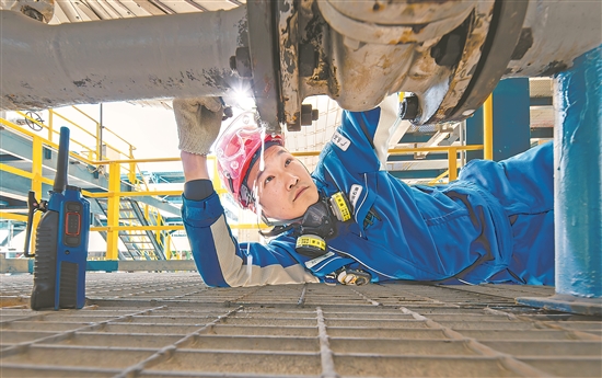 图为柴油加氢装置班长刘通检查生产装置有无泄漏情况。吕殿杰 杨昕 摄影报道