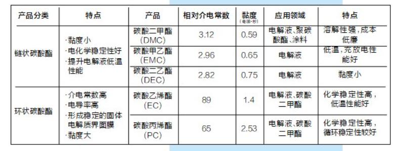 有机溶剂是电解液产品中用量最大的成分,占电解液产品质量的80%以上。有机溶剂主要用于溶解锂盐,并为锂离子提供传输的环境;需要具备较高的介电常数、低熔点、高沸点、较好的化学稳定性及低黏度等特征。常见的电解液有机溶剂包括碳酸酯类、醚类及新型氟化溶剂等。目前市场上95%以上商业化使用的溶剂以有机碳酸酯类溶剂为主。根据其分子结构的不同,碳酸酯类溶剂可进一步分为环状碳酸酯(碳酸乙烯酯、碳酸丙烯酯等)与链状碳酸酯(碳酸二甲酯、碳酸二乙酯、碳酸甲乙酯等)。一般来说,环状碳酸酯溶剂具有较高的介电常数、离子电导率,但黏度较大;链状碳酸酯溶剂黏度小,介电常数也较低。同时,不同电解液的物化性质不同,与正负极材料的相容性也有一定差异。因此,目前商业化的电解液一般使用几种碳酸酯溶剂混合体系。其中,使用量最大的溶剂为碳酸二甲酯、碳酸乙烯酯、碳酸甲乙酯和碳酸二乙酯这四种,其需求总量占电解液有机溶剂需求总量的93%以上。
