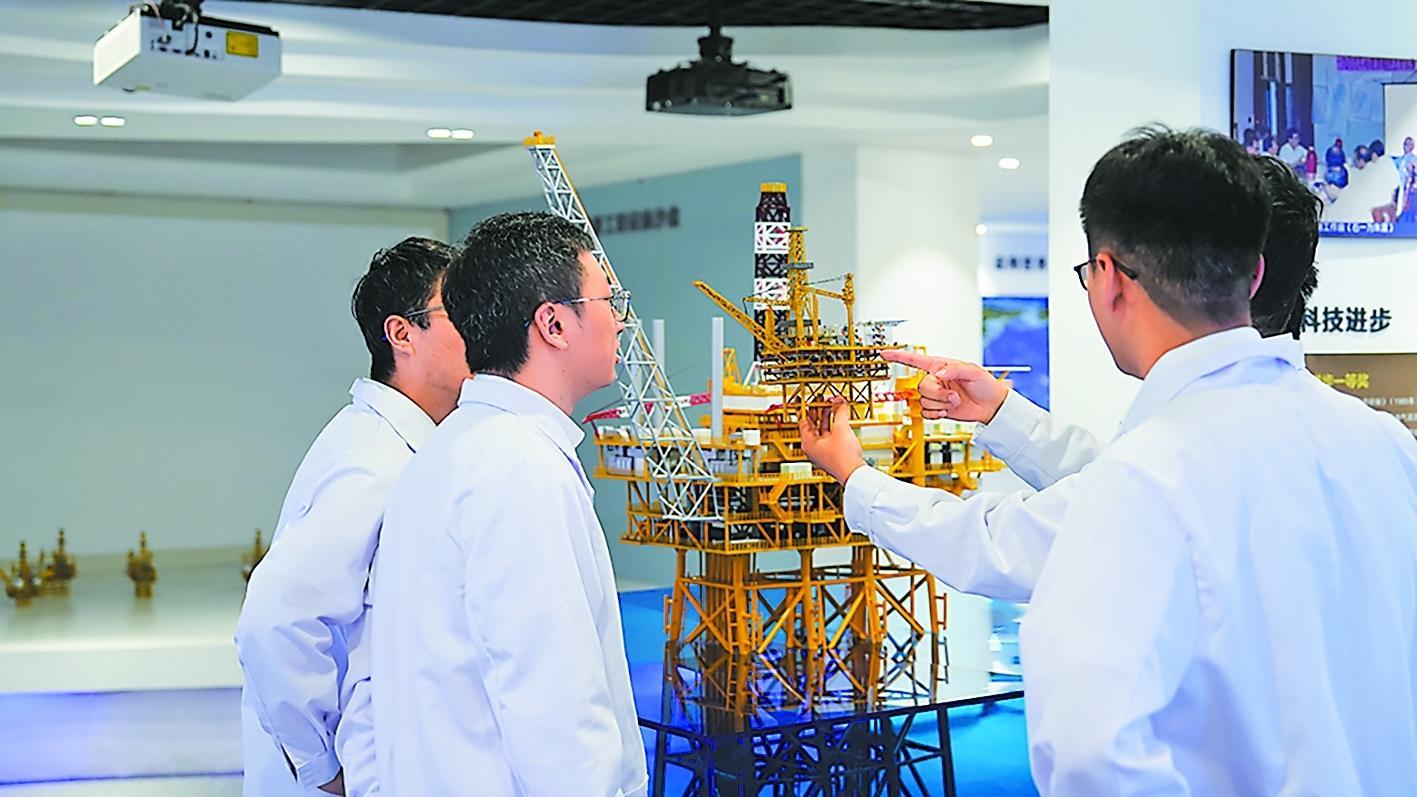 科研人员在导管架平台模型前研究探讨。上海海洋油气分公司 供图