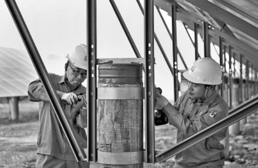 近期,胜利油田新能源开发中心与设计单位合作,将桩基光伏支架单立柱焊接改为双立柱抱箍紧固,减少了焊接工序和焊接点作业,有效缩短了工期,降低了风险。目前,该中心已有7兆瓦光伏项目采用新工艺。图为8月27日,在胜利采油厂504光伏电站现场,中心技术人员在对桩基光伏支架进行抱箍紧固作业。