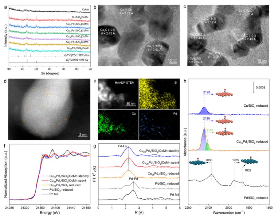 团队开发合成的CuxPd1/SiO₂|CoMn多功能催化剂,通过氢溢流介导的空间解耦过程,实现了高CO转化率和ROH选择以及低C1副产物生成的优异反应性能,催化剂PdCu单原子合金和Co0-Co₂C双活性位点结构。 PdCu单原子合金的氢溢流效应,促进H2的活化及CO₂加氢产物的生成,提高了CO的转化率和ROH选择性,抑制CO₂和CH₄的生成,提高C5+以上醇含量。