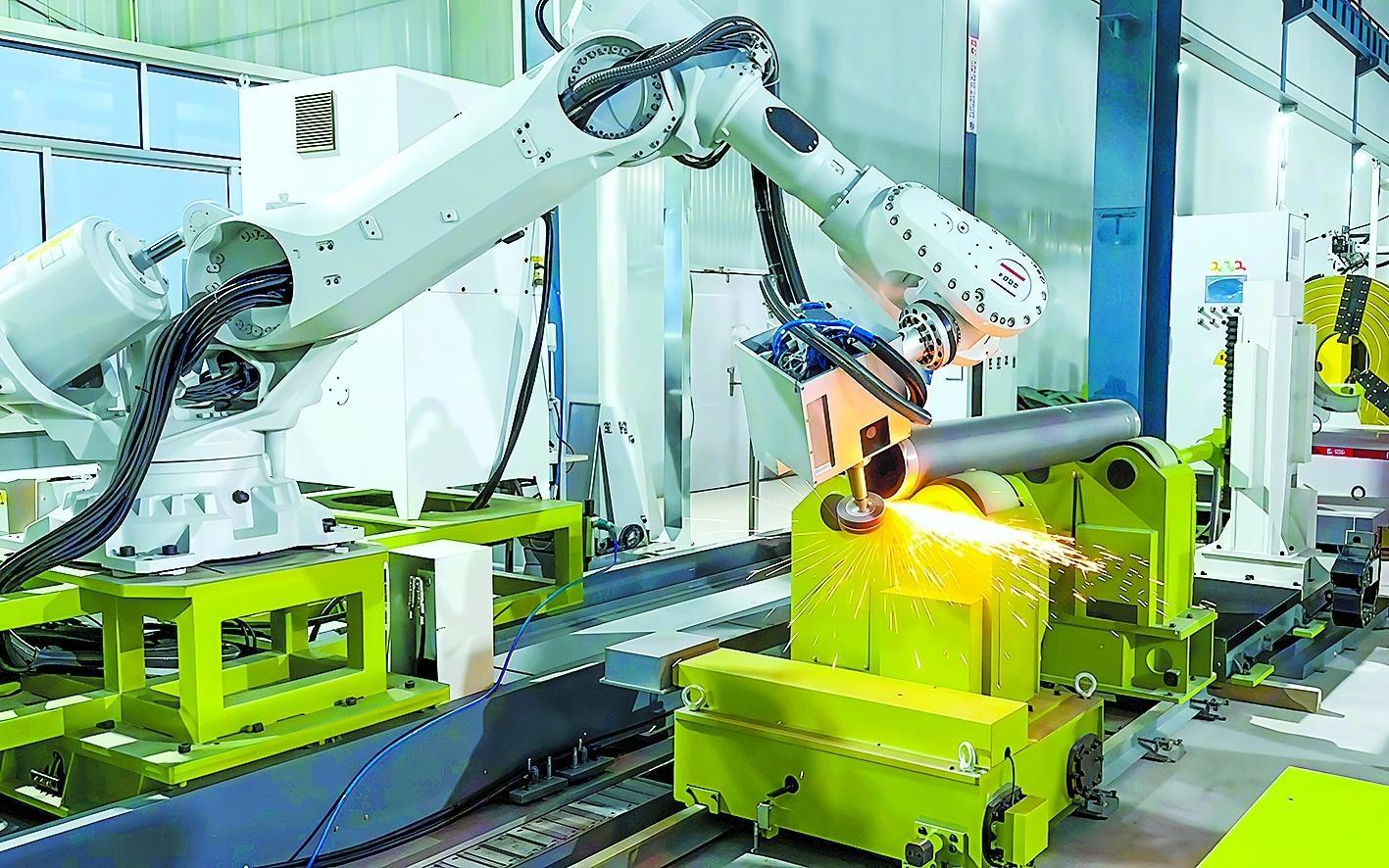 十建公司研发的国内首条管道智能预制生产线春节假期“不打烊”,全力保障集团公司重点建设项目管道及钢结构预制施工高质量推进。目前,该生产线完成管道预制安装3000寸径、钢结构预制近200吨。图为2月18日,管道智能预制生产线上的机器人在对管道坡口进行打磨作业。