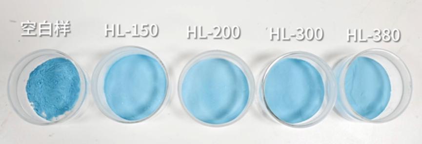 与空白样相比,HL-150和HL-200样品组几乎未见白点,粉末表面均匀细腻,而HL-300和HL-380样品组则出现轻微白点,在震荡均匀后的表面可观察到零星分布。这一现象提示:在相同分散条件下,高比表面积的亲水型气相二氧化硅更易导致白点产生。