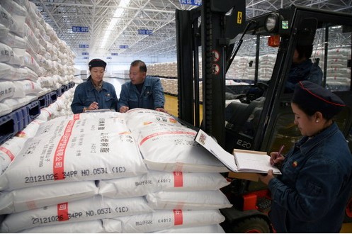 图为独石化乙烯厂员工将聚丙烯树脂产品入库。张太亭摄