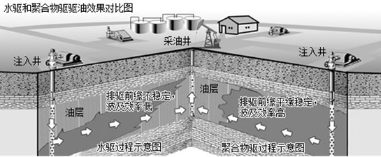 聚合物驱是一种改善水驱的化学驱油方法。它使用水溶性高分子聚合物作为添加剂,将其作为油田开发的注入剂,增加注入水黏度,降低水相渗透率,进而大大降低水油流度比,提高平面波及效率,克服注入水的指进,减缓水沿着高渗透层窜进,提高垂向波及效率,增加了吸水厚度,聚合物溶液通过后仍可保持对水的残余阻力,达到提高采收率的目的。