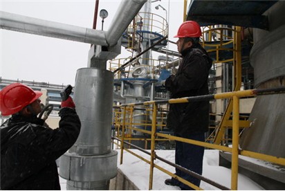 技术人员用测温枪观察催化剂反应温度。(张晓君摄)