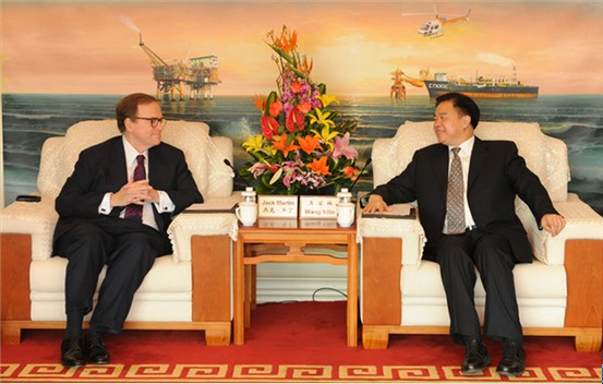 3月29日上午,总公司董事长王宜林在北京中国海油大厦会见了来访的伟达公关顾问公司董事长杰克?马丁一行,双方就合作事宜交换了意见。(记者刘梦涛摄影报道)